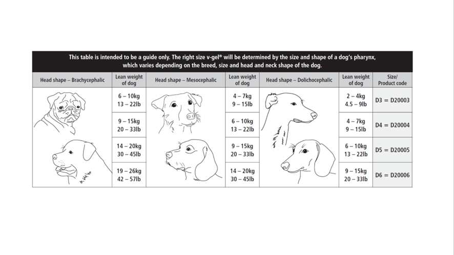 Debemos utilizar la guía de tallas que se basa en la forma de la cabeza y el peso corporal ideal del paciente. Para razas meso y dolicefálicas, si el paciente se encuentra entre dos tamaños diferentes de v-gel®, generalmente es mejor elegir el más grande. Los perros braquicéfalos tienden a tener una faringe pequeña, por lo que, si hay dos grupos de tamaño, elija el más pequeño de los dos.